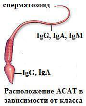 Они могут прикрепляться к поверхности сперматозоида, а такой «груз» будет «непосильной ношей», поэтому ему будет сложно добраться до яйцеклетки. Антиспермальные антитела класса IgG чаще всего прикрепляются к головке и хвосту сперматозоида, антитела класса IgA обычно прикрепляются к хвосту и в некоторых случаях к головке сперматозоида, антитела класса IgM обычно прикрепляются в области хвоста. Локализация в области хвоста в наибольшей степени влияет на подвижность сперматозоида, что особенно важно при прохождении его через цервикальный канал. При локализации в области головки подвижность значительно не нарушается, но это может повлиять на пенетрационные свойства.